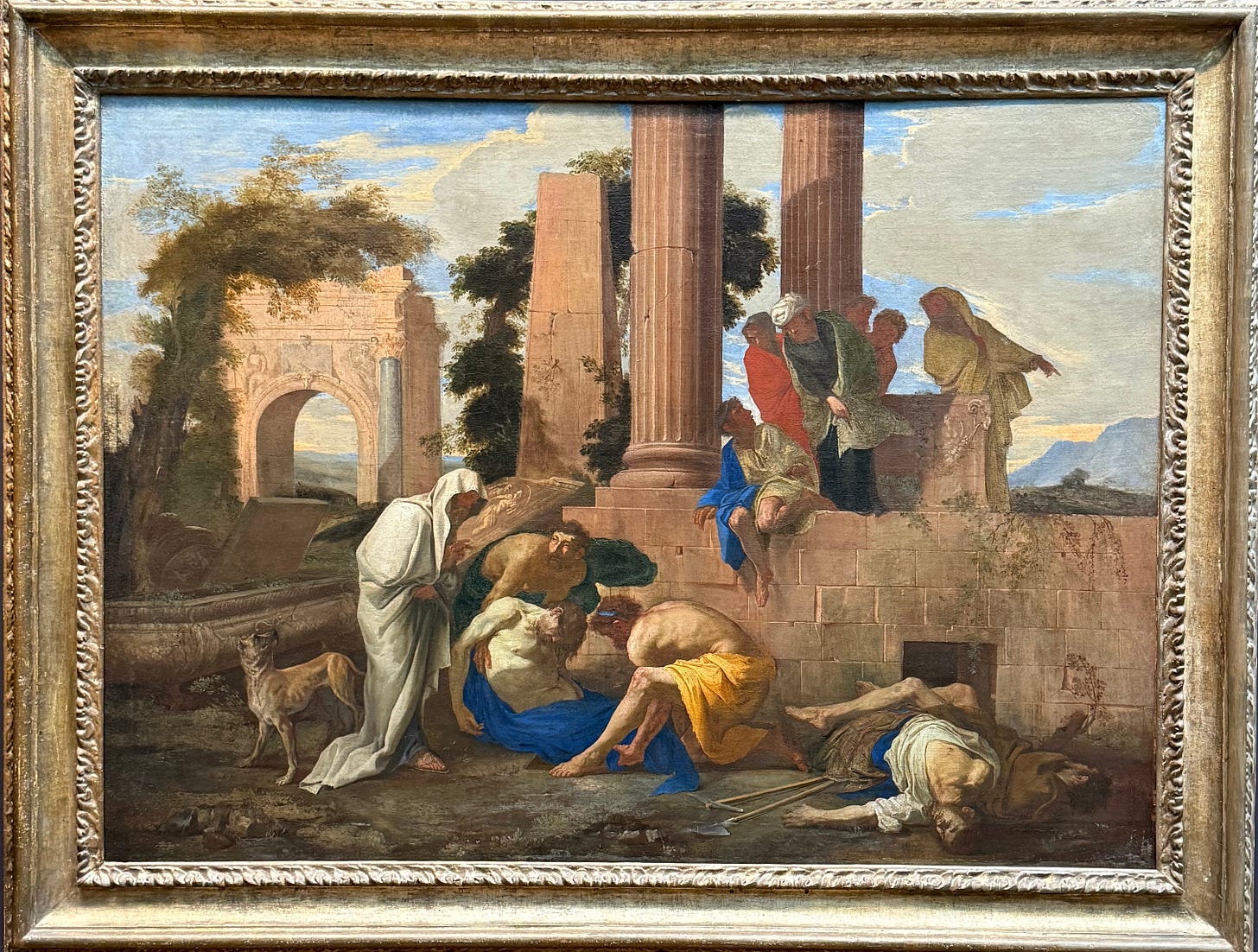 On the lower right, two corpses draped one over the other await burial. Left of centre is Tobit, cloaked in white (an archaic kittel?). He oversees the burial of a dead man, naked but for a loose blue shroud. Two crooked fingers emerge from Tobit’s cloak in a gesture of blessing. Among the dozen figures, the man holding the limp torso has the only legible face (aside from the questioning dog’s). There’s not much to read in it beyond patient straining. He looks up at Tobit before finishing the job, waiting for a sign that the prayer has ended. On the porch above, a group of agitated men keep watch in the shadow of two fluted columns and a broken obelisk hugged by a tree. One of them points toward the distance below, his vague face turned to Tobit as if in warning. These are Jews exiled in Nineveh after the Assyrian conquest of their native Samaria. We see them breaking the Assyrian king’s law by burying their dead within his city limits. As everyone knows, though, God’s law takes precedence over a mere king’s. That’s the message of the painting. It would have been obvious to Neapolitans in the 17th century, and meaningful, given the corpses that also littered their city. Only historical coincidence makes it meaningful to us, and let’s pray that it’s temporary.