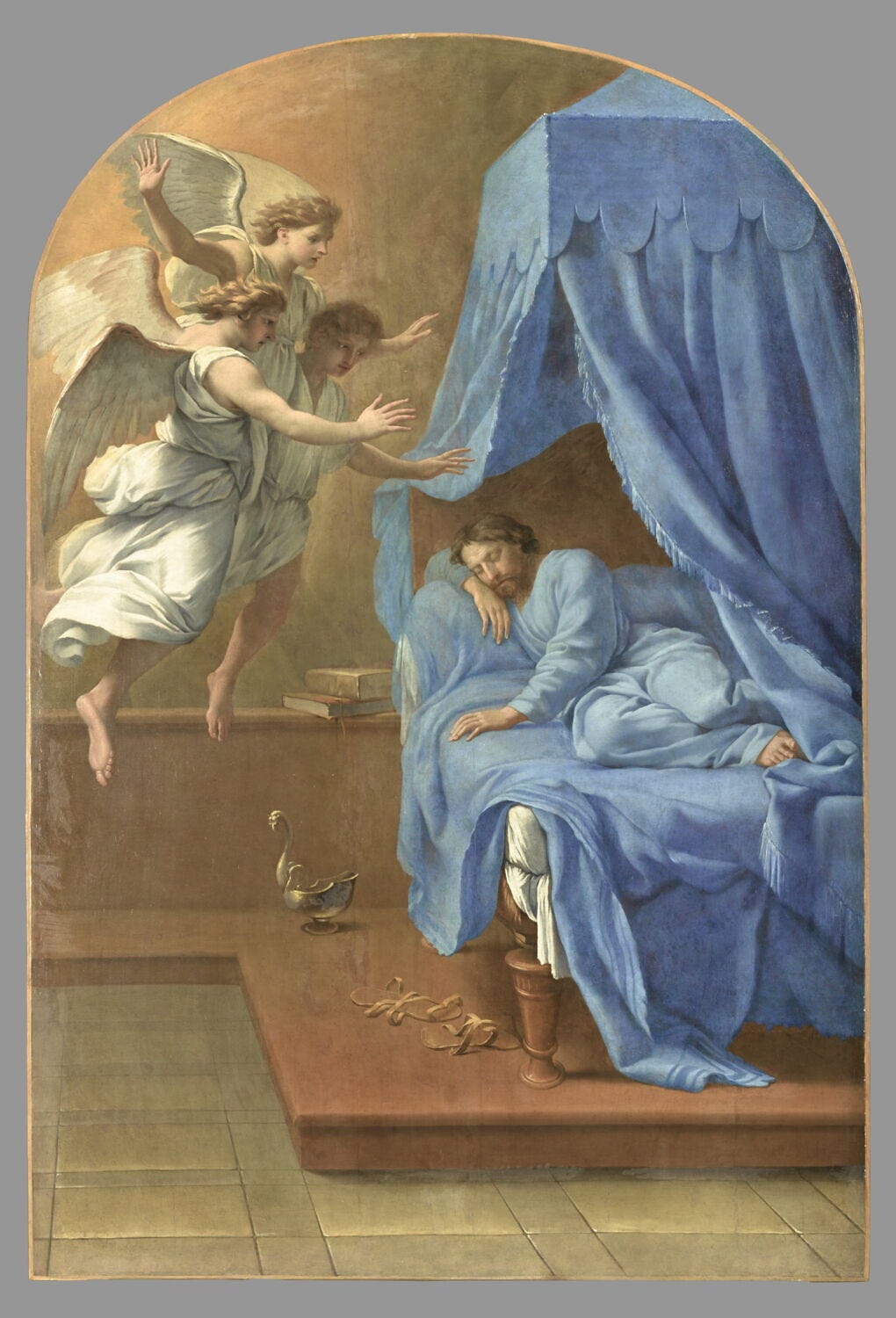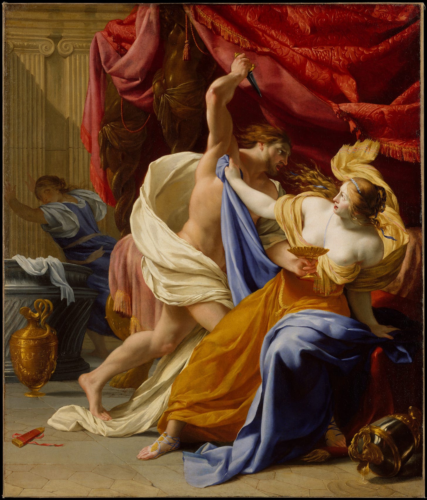 Unlike the spartan Dream of Saint Bruno, there are many colours in this Le Sueur. The culprit’s bed—where he feigned illness to lure compassionate Tamar—is red and pink; his victim’s skirt is deep saffron. (If you squint, you might foresee Henri Matisse.) Although Poussinists, as a rule, didn’t paint emotional faces, Le Sueur gives it a try for the dramatic scene. He summons his inner Vouet, but without great success, I think. And the gratuitous dagger is unfortunate: it muddles the story by suggesting that Amnon means to kill her. The artist was still quite young—about the age I was bussing tables in Toronto.